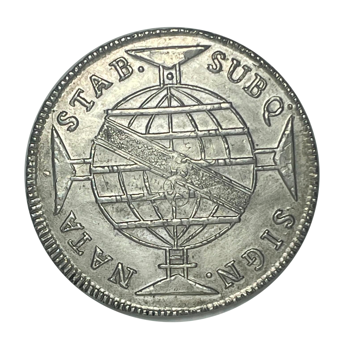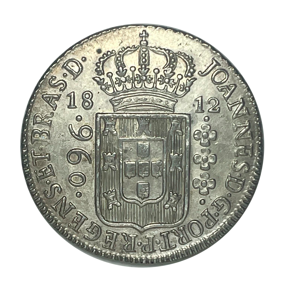Moeda de 960 Réis, cunhada em 1812 na Casa da Moeda da Bahia (letra monetária B), durante o reinado de D. João VI, no período do Reino Unido de Portugal, Brasil e Algarves. Essa peça histórica é conhecida como “Patacão” e foi produzida através da sobrecunhagem de moedas de 8 Reales de prata, muito comuns na circulação internacional da época.