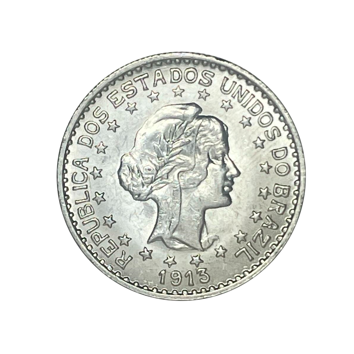 Moeda brasileira de 1000 Réis, emitida em 1913, durante o período da República. Este exemplar é conhecido entre os colecionadores pelo detalhe distintivo no reverso, onde as estrelas ao redor do brasão aparecem com espaçamento mais solto — característica que lhe rendeu o apelido “Estrelas Soltas”.