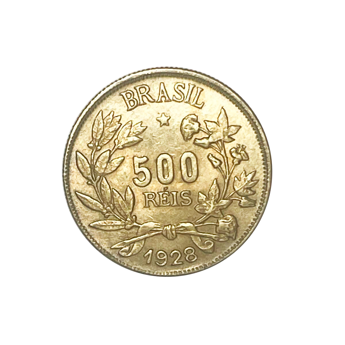 Moeda brasileira de 500 Réis, emitida no ano de 1928, durante o período da República. Fabricada em bronze e alumínio, essa peça representa uma das edições clássicas da numismática nacional. Apresenta excelente estado de conservação, Soberba/Flor de Cunho, sendo ideal para colecionadores que valorizam autenticidade e acabamento.